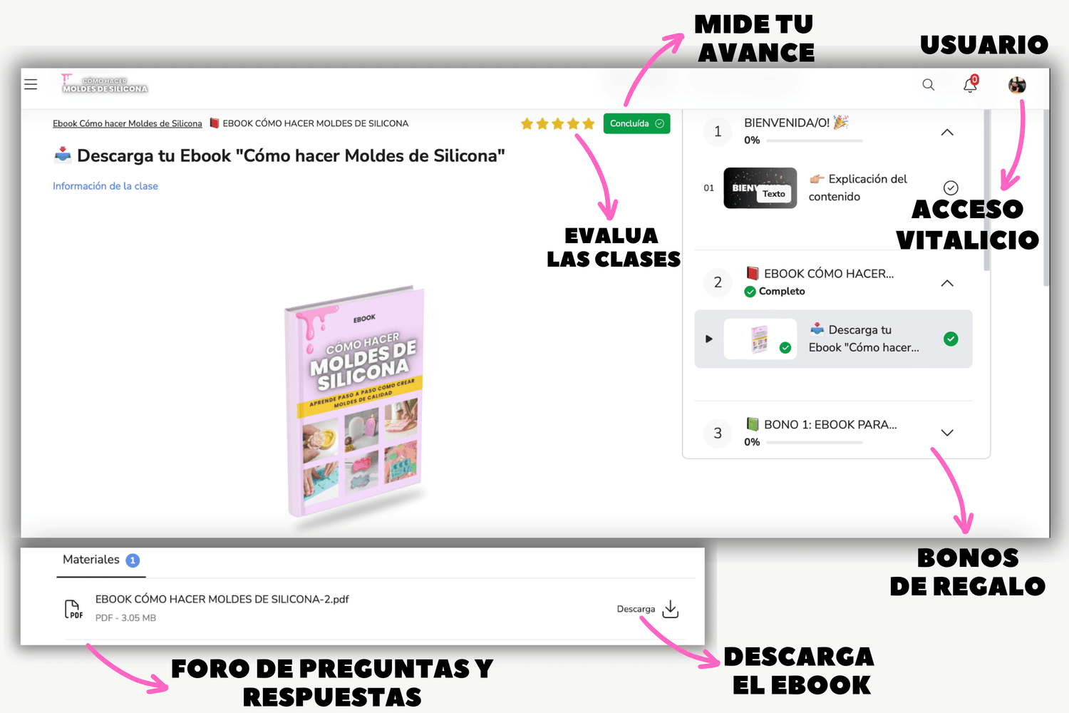 Dentro del Ebook te especificamos que materiales necesitarás para realizar tus moldes de silicona, te entregamos material de apoyo y te mostraremos dónde conseguirlos.